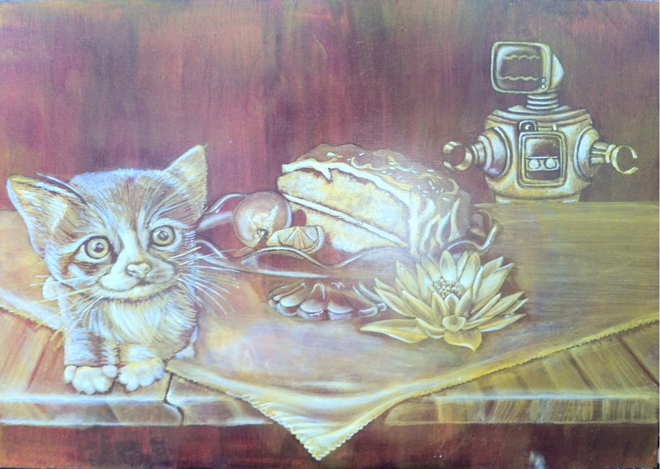 In this phase of the process, the entire painting is covered by a semi-transparent yellow glaze and tempera is applied to the areas with the most light. Unlike the previous layer where tempera is used to establish form and textures, here it is used to show the light pattern. This is the phase where the painting really begins to take on dimensionality.
