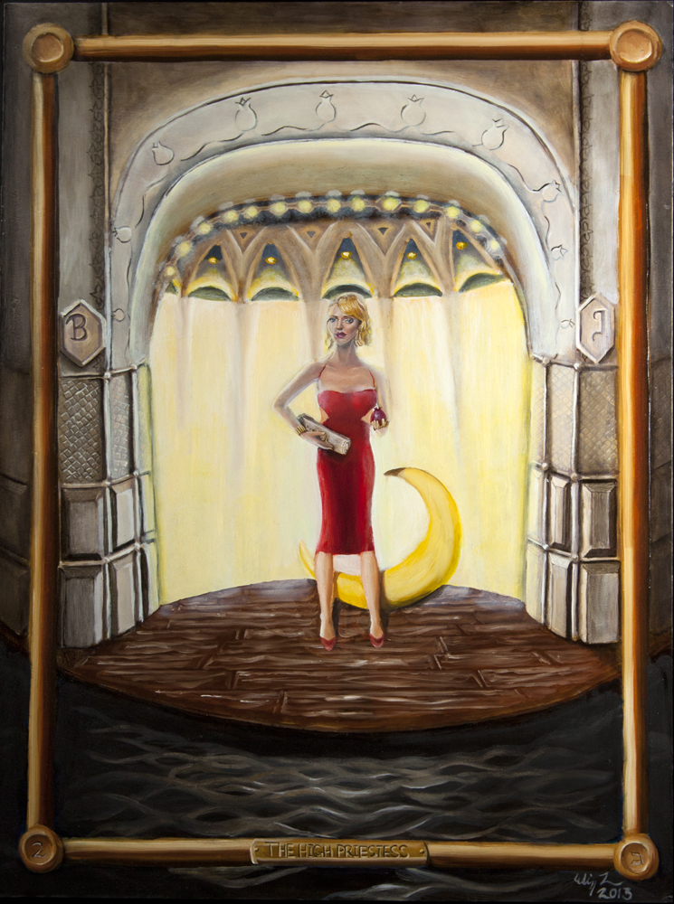 “The High Priestess”. 18″ x 24″. Oil and tempera on panel. 2012-2013. Part of Tarot Series. Featuring Six from “Battlestar Galactica”.