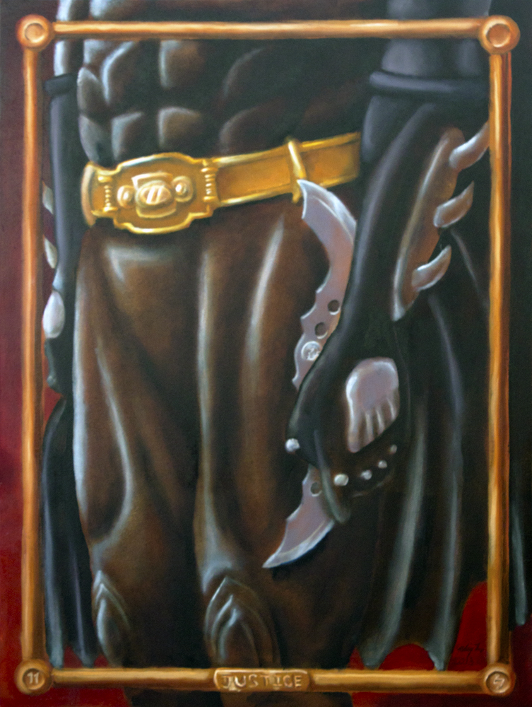 12″x16″. Oil and tempera on panel. 2013. Part of Zeitgeist Tarot. Featuring Batman.