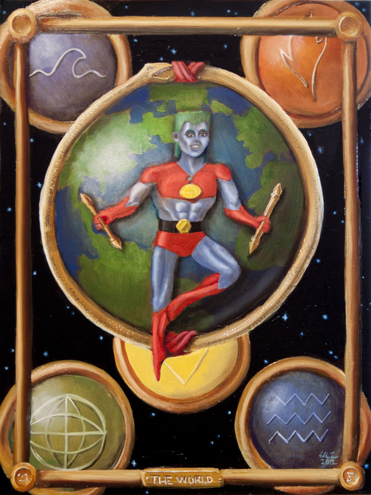 Part of Tarot Series. 12″ x 16″. Oil and tempera on panel. 2012. Featuring Captain Planet. Available.